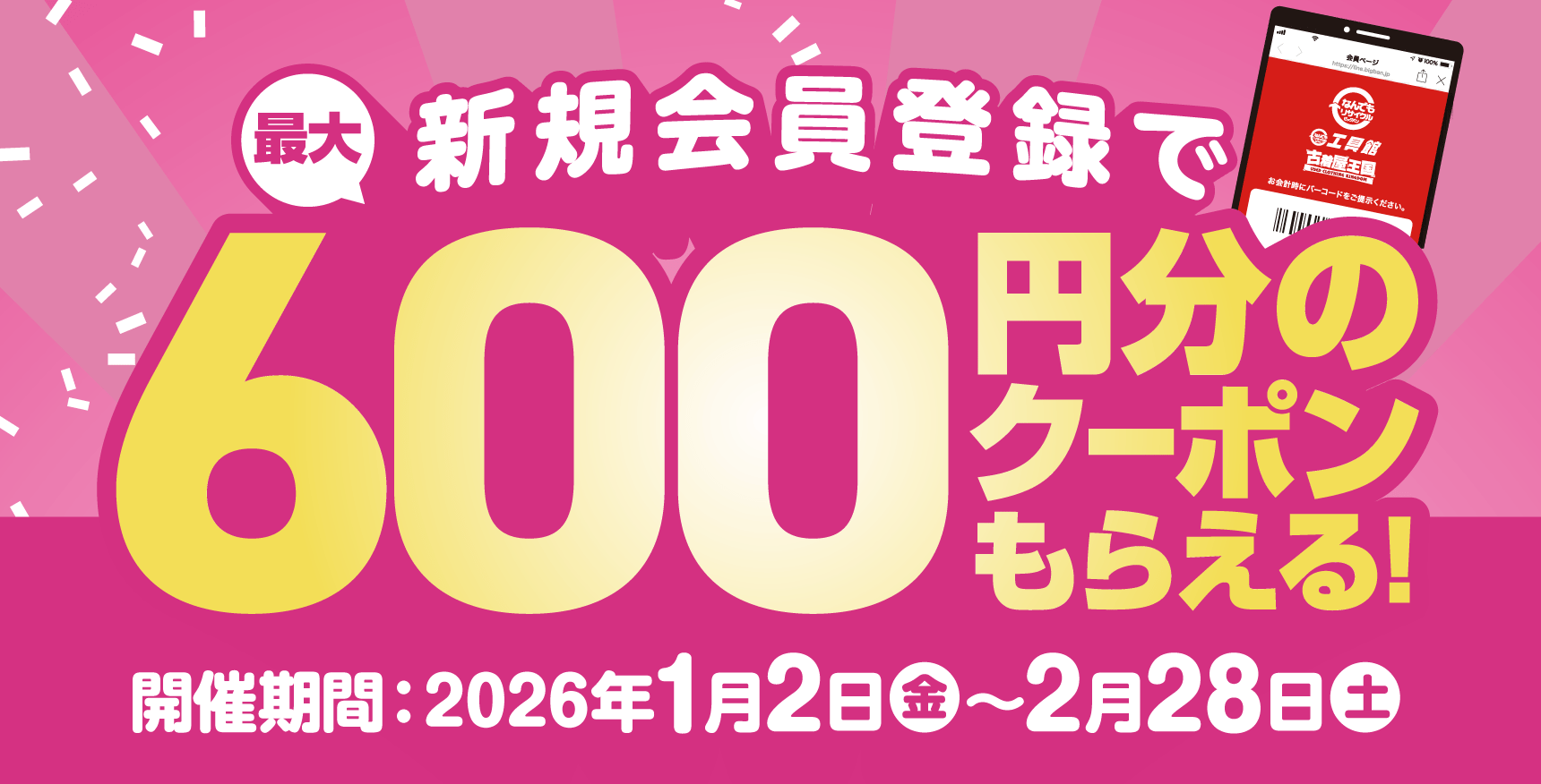 - 2026.01.01 お知らせ 【最大600円分】バンバンポイント 新規会員登録キャンペーン開催!お得なクーポンをGETしよう