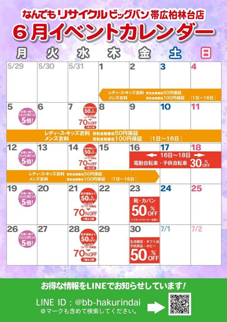 ビッグバン帯広柏林台より、6月のイベントカレンダーのお知らせです!
