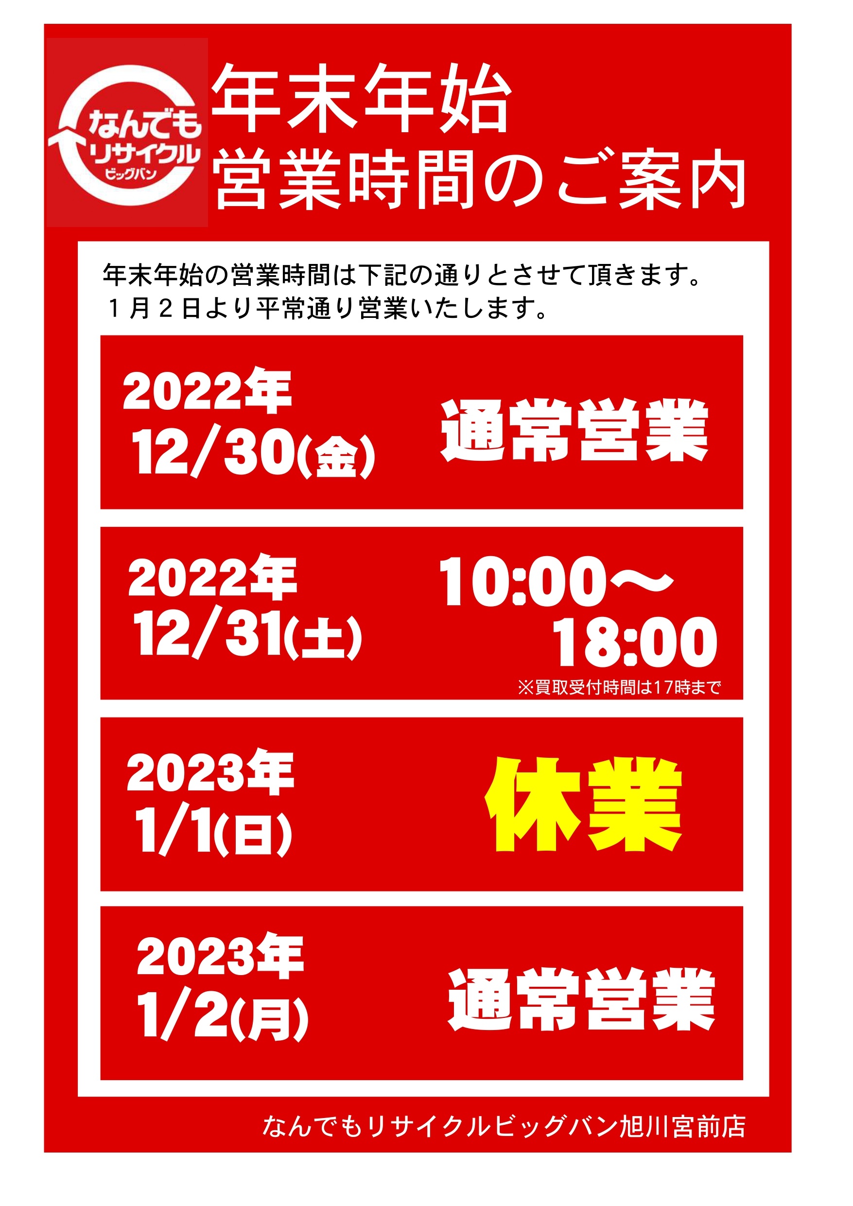ビッグバン旭川宮前店:年末年始営業時間のご案内