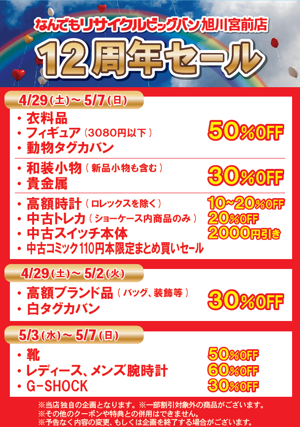 【お知らせ】ビッグバン旭川宮前店 ✨12周年セール開催✨(2023/4/29~5/7)