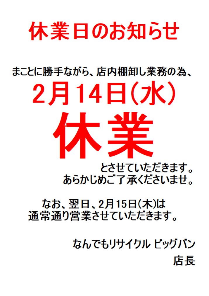 2024年2月14日(水)は、当店棚卸のため全日休業とさせていただきます。