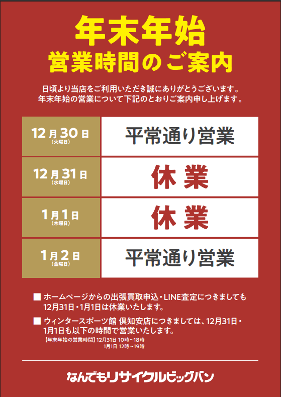 いつもなんでもリサイクルビッグバン旭川宮前店をご愛顧いただき、誠にありがとうございます。 本年も残すところあと僅かとなりました。皆様には格別のご愛顧を賜り、厚く御礼申し上げます。