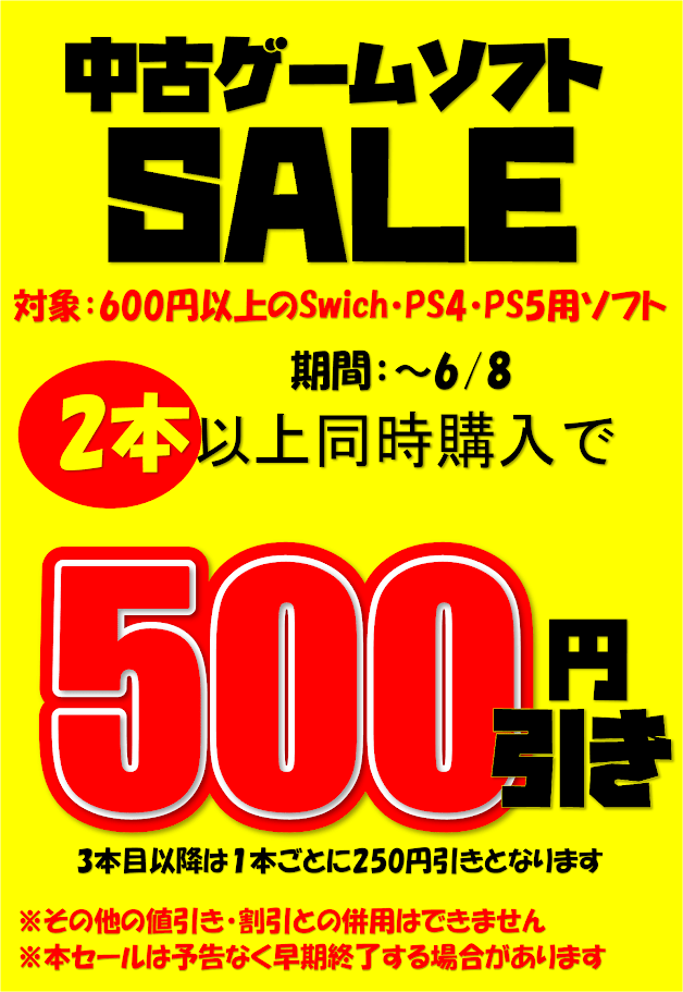 switch、PS4、PS5の600円以上のソフトを2本同時購入で500円のお値引き。