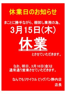 ビッグバン静内店より、棚卸休業のお知らせです。
