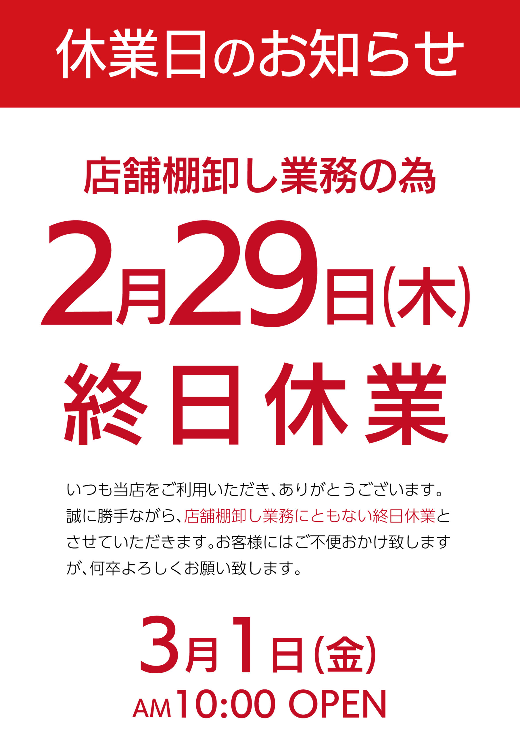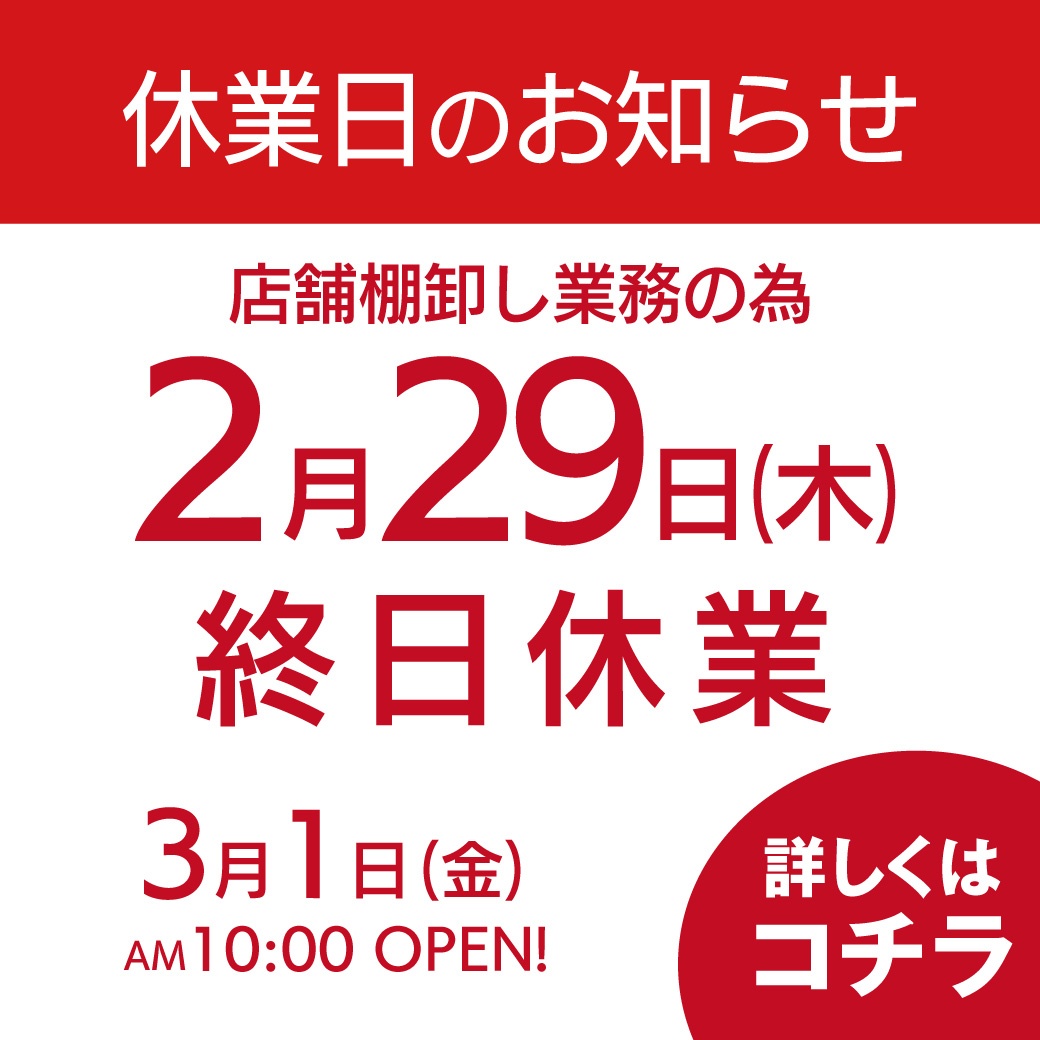 誠に勝手ではございますが、2月29日(木)は当店棚卸に伴い終日休業とさせていただきます。