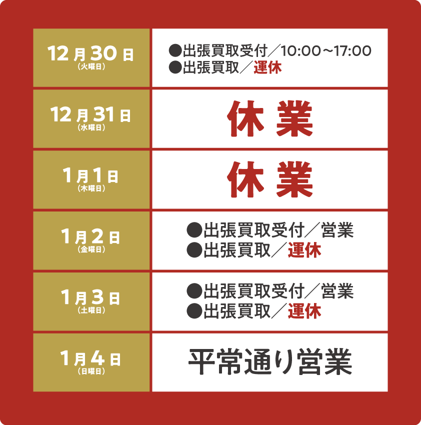 宅配買取・LINE査定サービスともに店舗同様、2025年12月31日(水)・2026年1月1日(木)は受付・査定を休止させていただきます。休業期間中にお問い合わせいただいた内容につきましては、2026年1月2日(金)以降にご返信させていただきます。