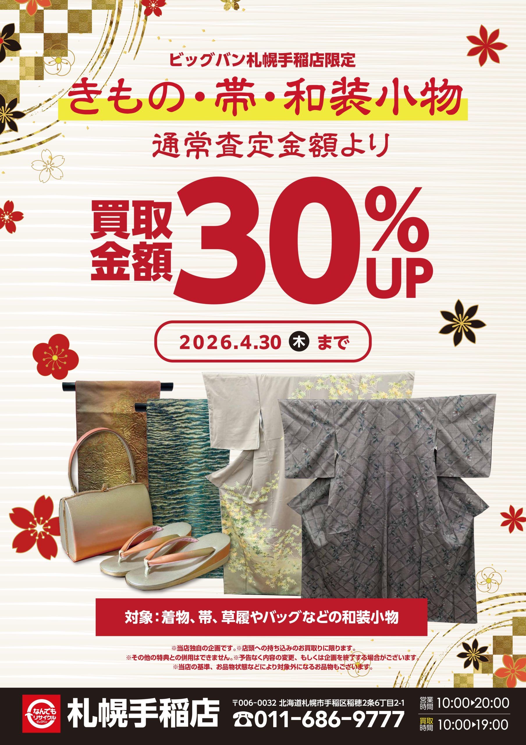 【札幌手稲店】着物・帯・和装小物「買取30%UP」キャンペーン開催!