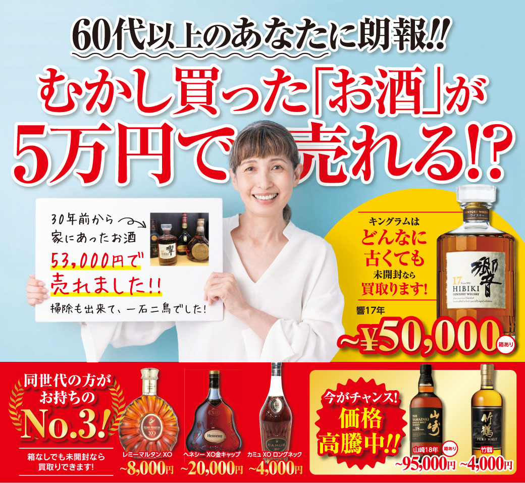 キングラムでは経験豊富な査定士がお酒のアイテムを最新の相場で買取りいたします。 売ろうか迷っているお品物も、お気軽にご相談ください。 お見積りだけでも大歓迎です。