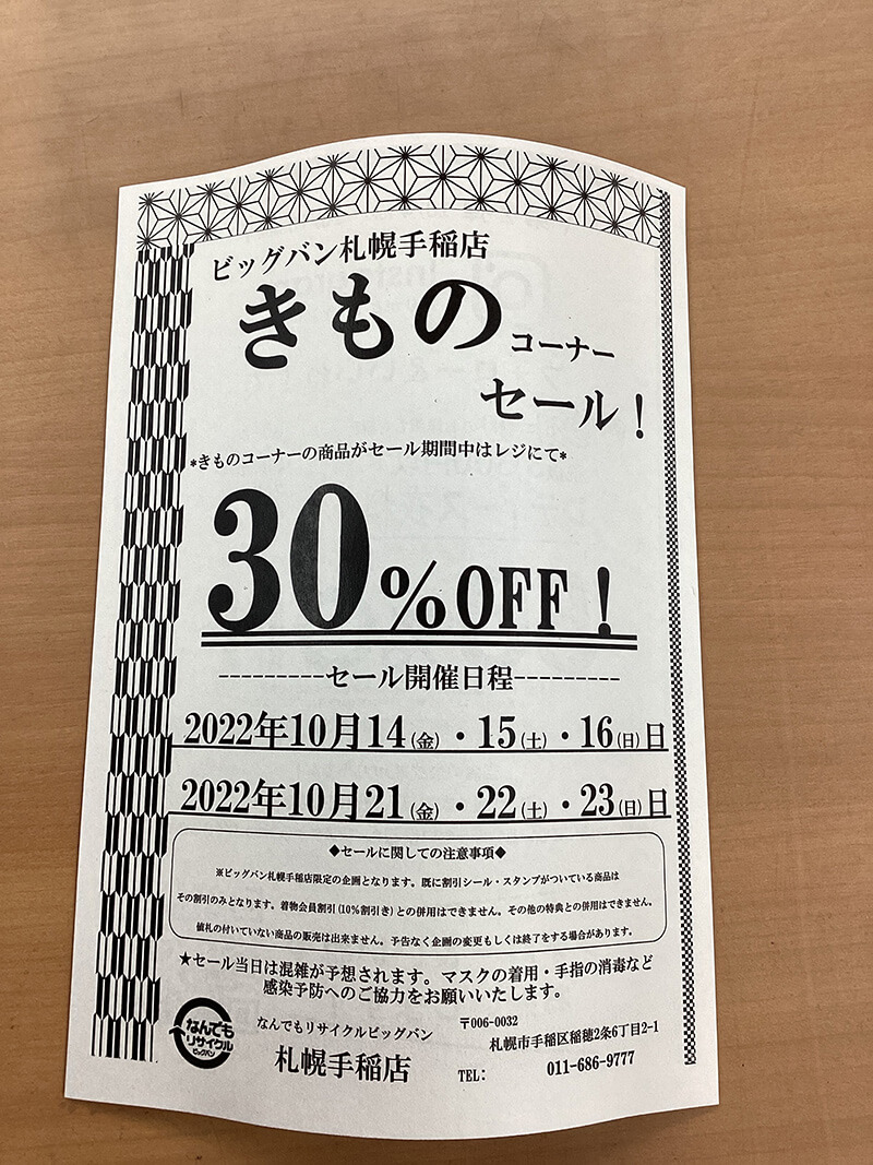 ビッグバン札幌手稲店着物コーナー、秋の着物セール開催決定しましたーー(๑>◡<๑)