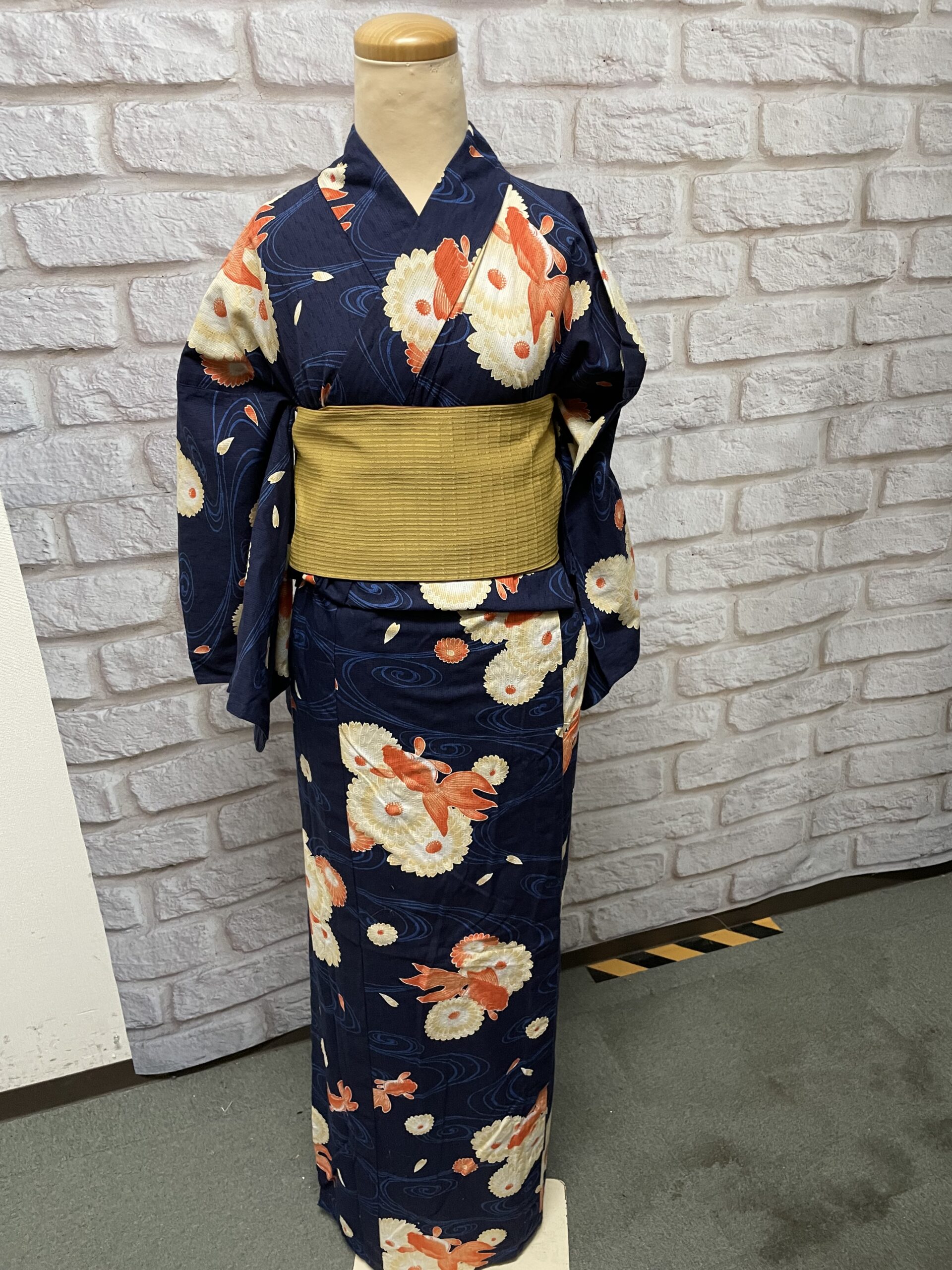 4番は水面に金魚とお花の柄が夏らしい紺色の浴衣に