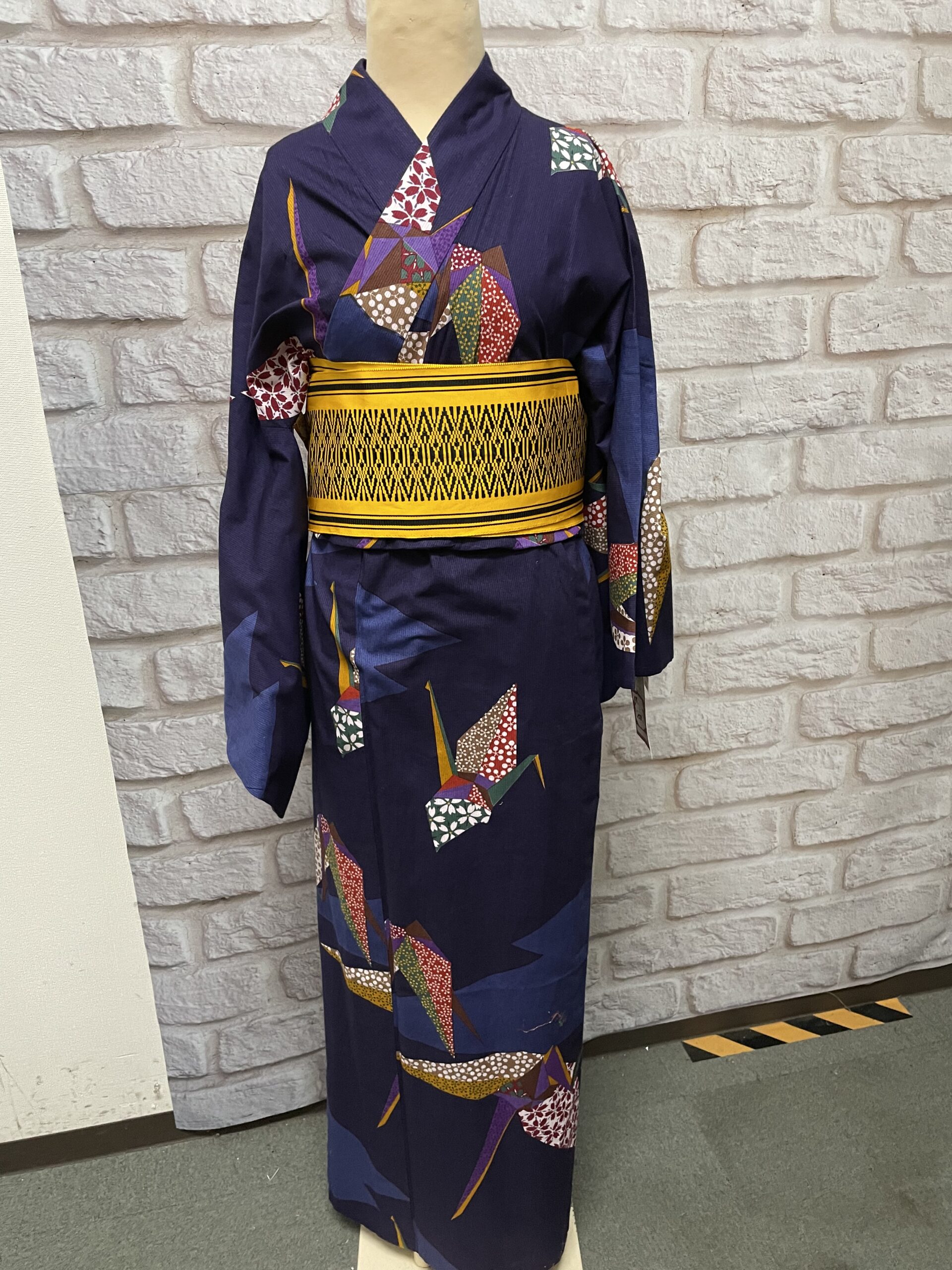 2番は紺色に色んな柄の千代紙で折った折り鶴柄の浴衣に