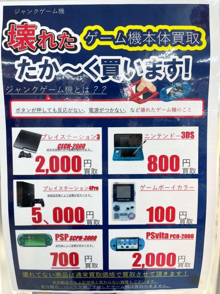 「ジャンク品だから…」と諦めないでください!電源が入らない、コントローラーがない、箱や説明書がなくても大丈夫!一台一台丁寧に査定いたします。思わぬレアソフトや周辺機器が見つかることも!