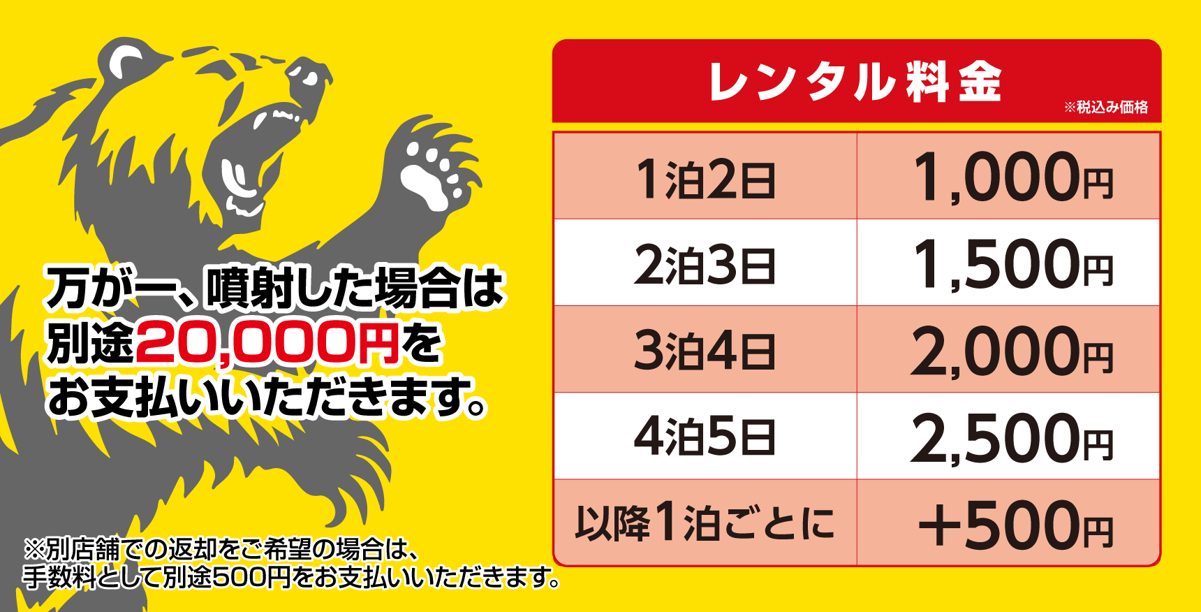 ・万が一ご利用された場合、レンタル料金に加えて別途20,000円をお支払いいただきます。これはスプレーの再購入費用と安全管理のための費用となります。ご理解とご協力をお願いいたします。
