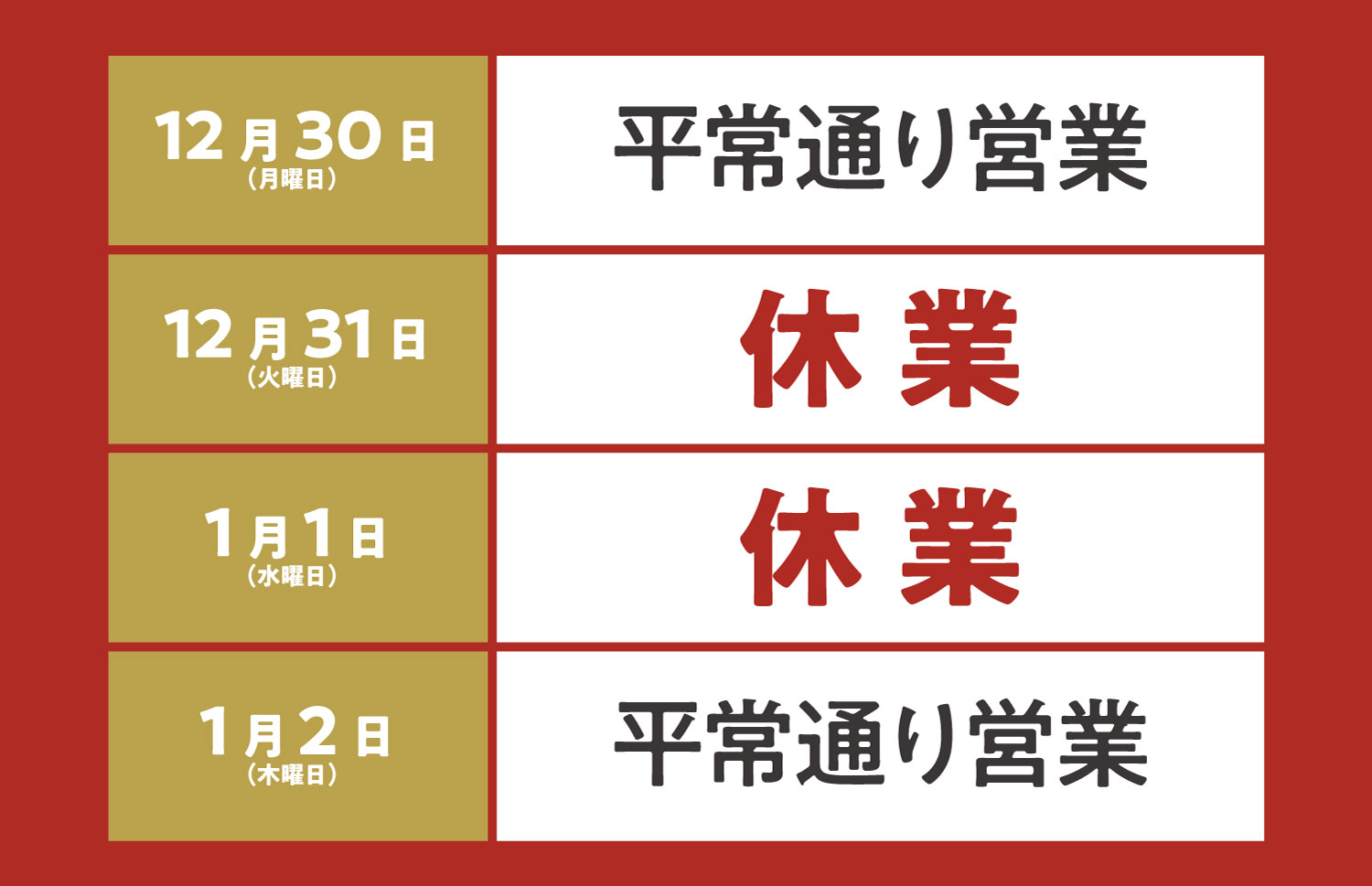 年末年始の営業時間について、下記のとおりご案内申し上げます。