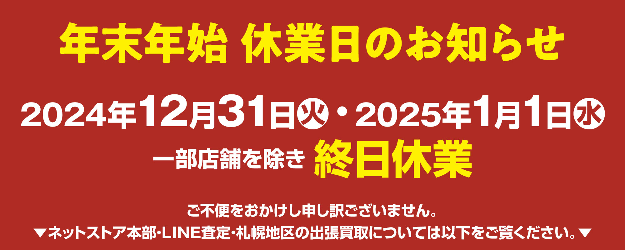 宅配買取・LINE査定サービスともに店舗同様、2024年12月31日(火)・2025年1月1日(水)は受付・査定を休止させていただきます。休業期間中にお問い合わせいただいた内容につきましては、2025年1月2日(木)以降にご返信させていただきます。