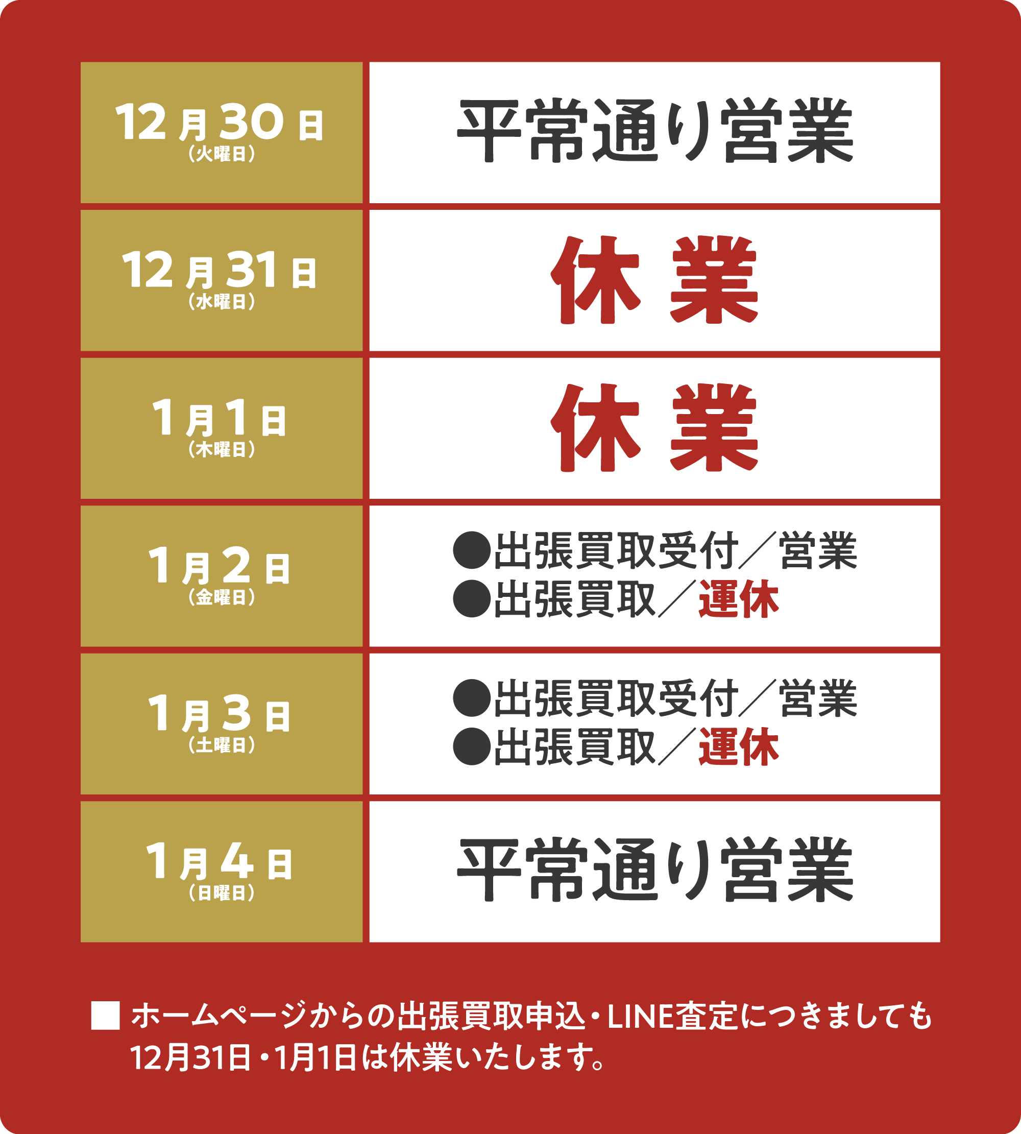 宅配買取・LINE査定サービスともに店舗同様、2025年12月31日(水)・2026年1月1日(木)は受付・査定を休止させていただきます。休業期間中にお問い合わせいただいた内容につきましては、2026年1月2日(金)以降にご返信させていただきます。