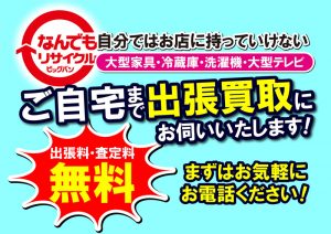 なんでもリサイクル ビッグバンでは、大型家具、冷蔵庫、洗濯機、大型テレビの出張買取を受付しております!