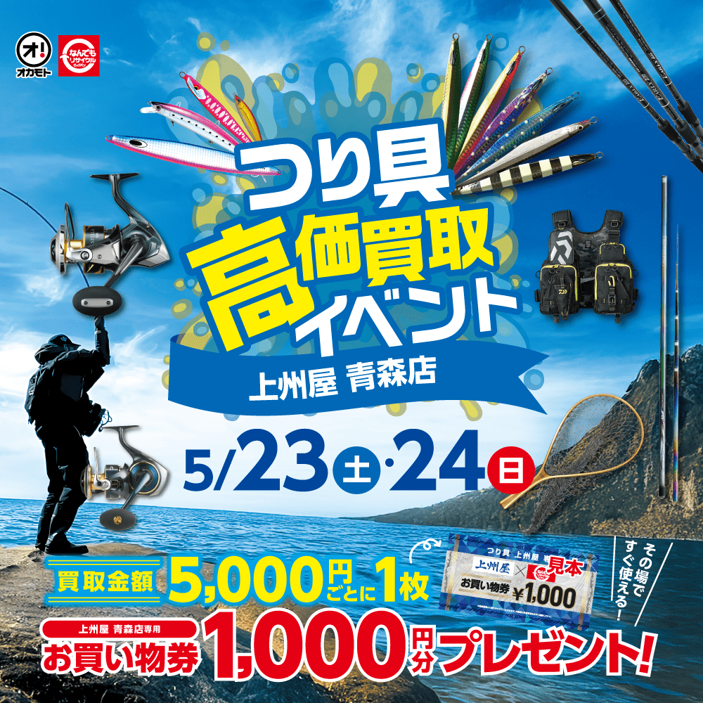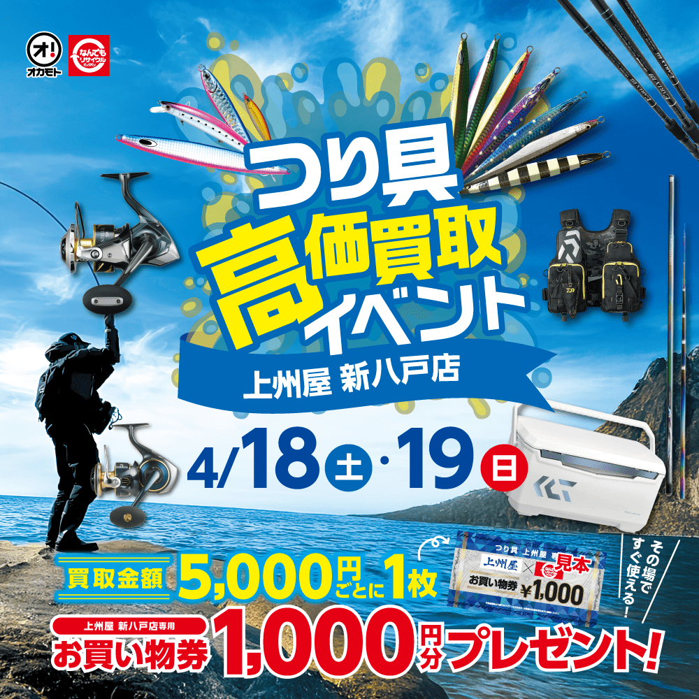 | ビッグバン釣具館 八戸沼館店 | 八戸市沼館1丁目13-45 | 0178-38-1961 | 10:00~20:00 (店頭買取は10:00~19:00) |