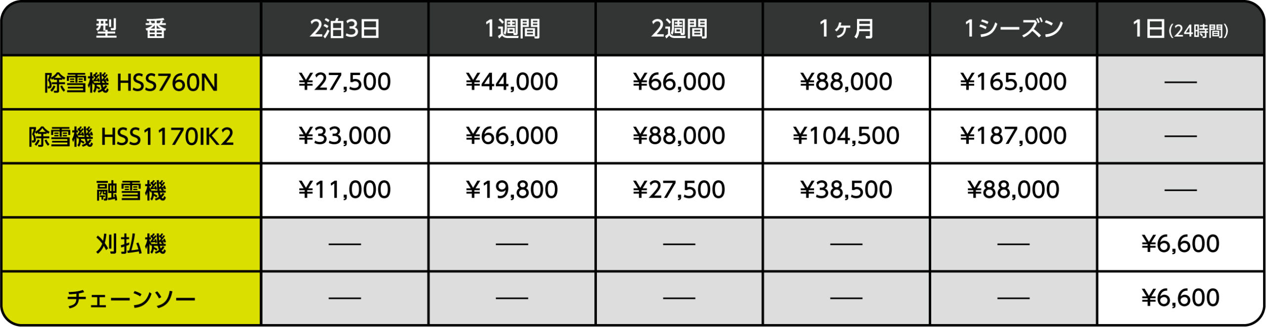 ※除雪機、融雪機の燃料、オーガボルトは別途料金です。