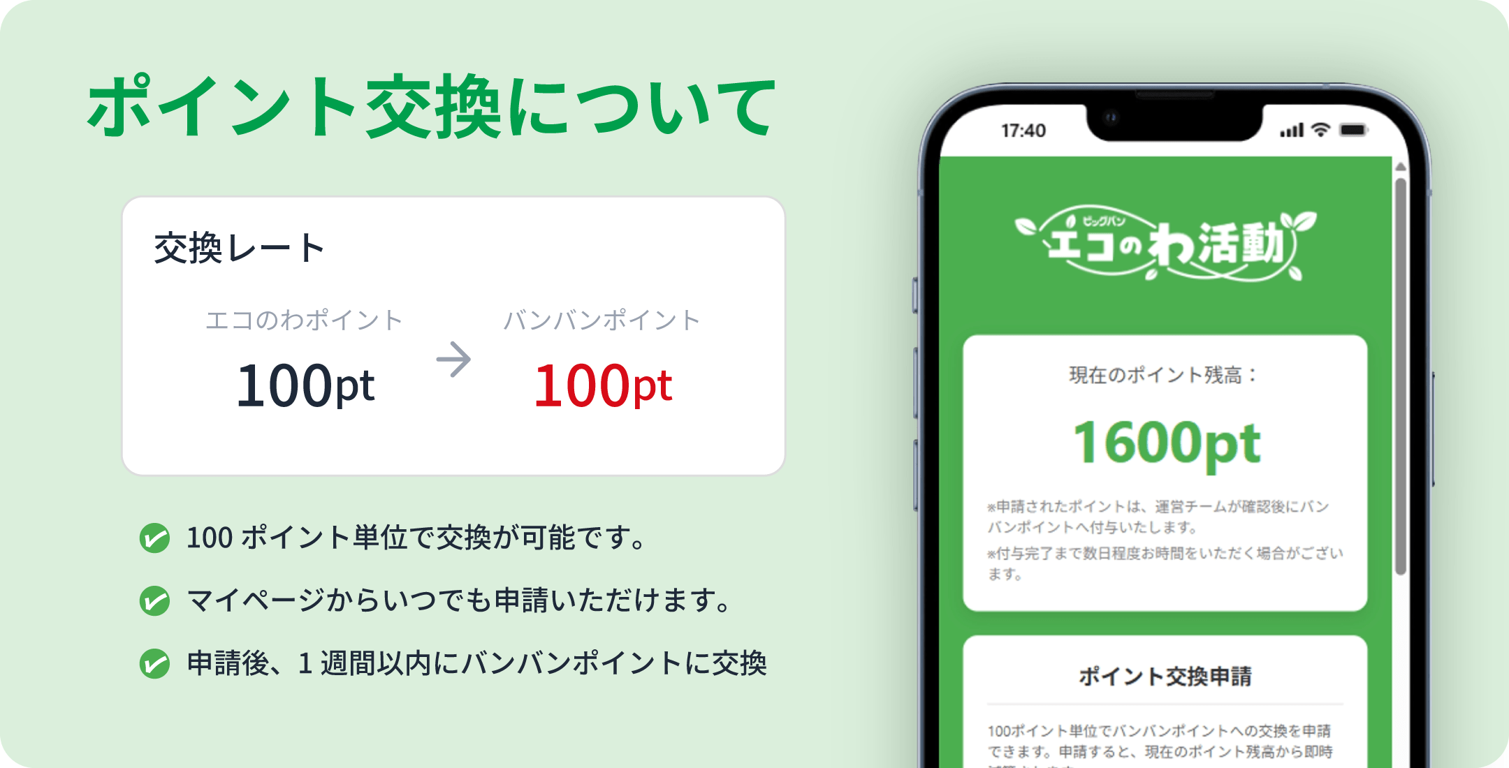 フードドライブへの食品寄与や地域のゴミ拾い活動など、地球にやさしい取り組みをしていただくと、お買い物に使える「バンバンポイント」を付与いたします。