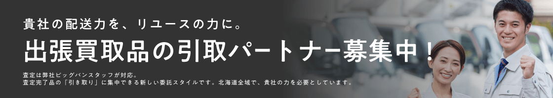 年間に10,000件以上のご家庭へ出張買取する機動力と、道内を中心に多店舗展開での販売力で運営しております。業者様、法人様も大歓迎でお伺い致します。
